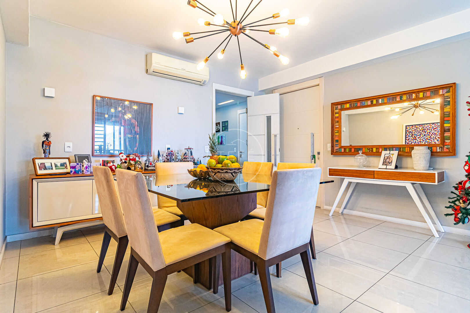 O imóvel conta com quatro suítes, sendo duas suítes tradicionais e duas suítes canadenses, além de lavabo e banheiro de serviço, totalizando cinco banheiros. A sala e os quartos possuem ar-condicionado, garantindo climatização ideal em todos os ambientes. A cozinha é moderna, com ilha e armários planejados que oferecem praticidade e sofisticação. O apartamento também conta com uma varanda ampla, onde é possível apreciar uma vista linda e relaxante. Localizado em andar alto, proporciona excelente iluminação natural e mais privacidade. Dispõe de duas vagas de garagem.