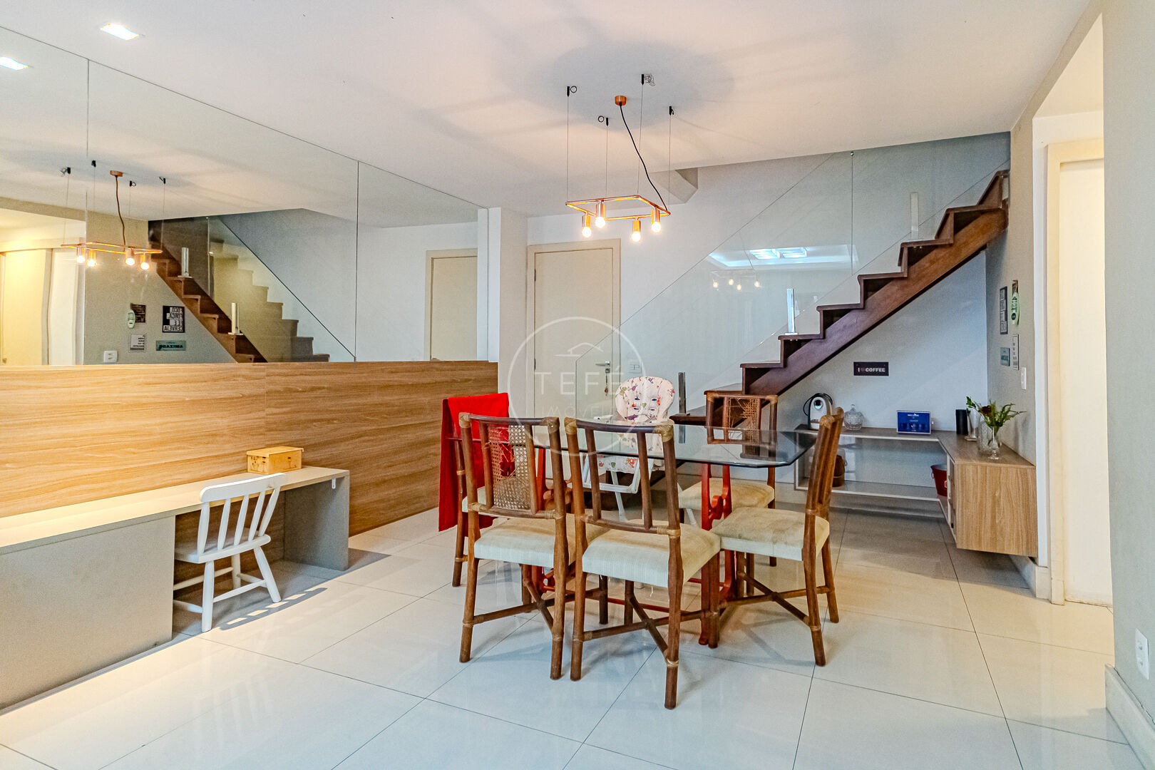 Por ser duplex, o imóvel oferece uma divisão inteligente dos ambientes, trazendo mais privacidade e conforto, além de um charme especial ao projeto.