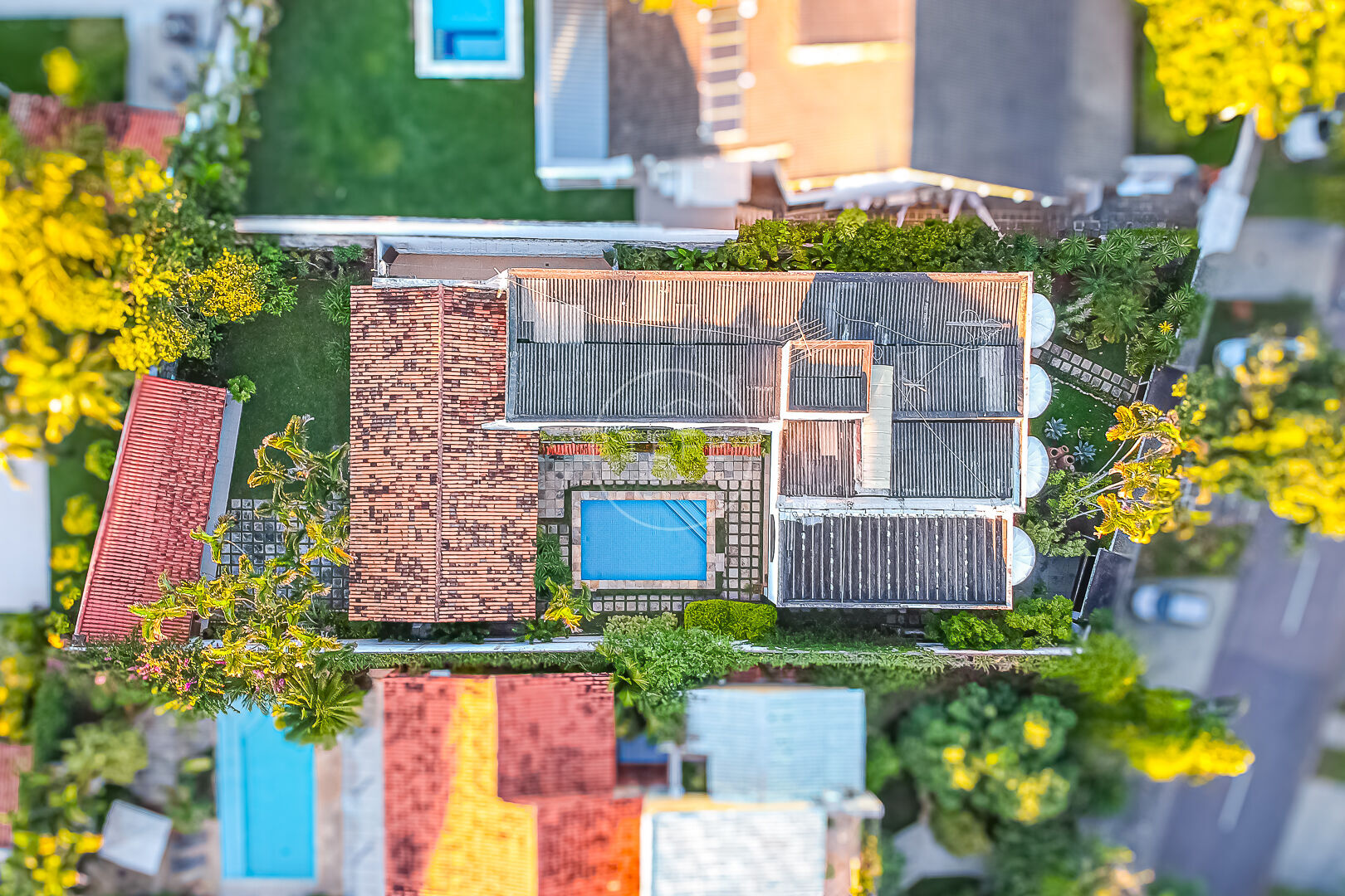 No segundo andar, a casa mantém o padrão de amplitude e conforto. São quatro suítes confortáveis, todas com varanda privativa que permite a entrada de luz natural. Além disso, o andar conta com lavabo e um espaçoso salão que se conecta diretamente à área da piscina.