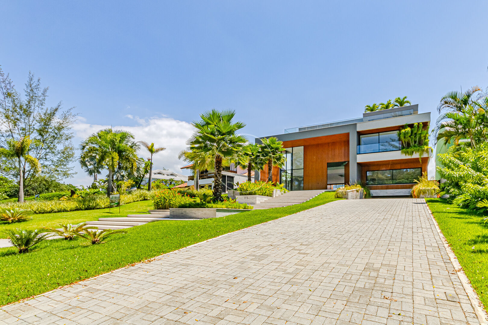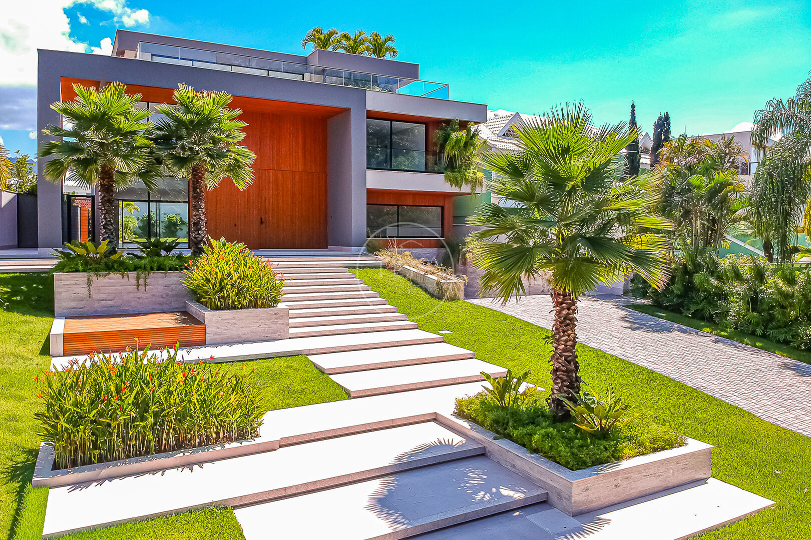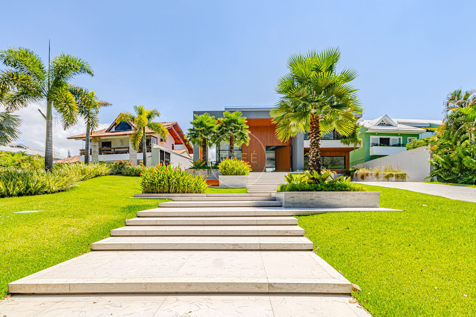 Logo ao chegar, você será recebido por um belo jardim frontal e uma elegante escadaria que conduz à porta principal, antecipando o requinte presente em cada detalhe.