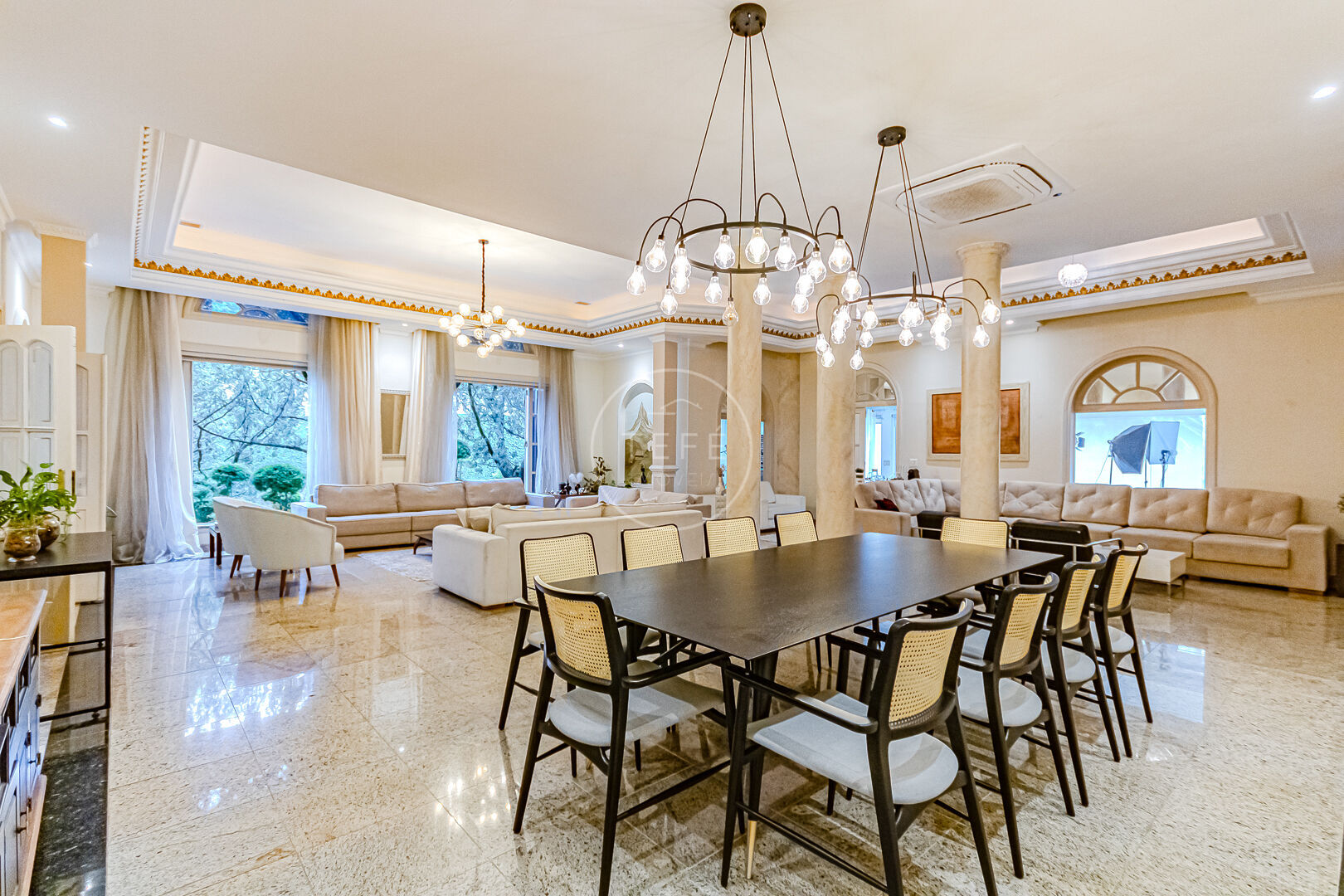 Ao entrar, a casa surpreende com uma imponente escada dupla e uma ampla sala em múltiplos ambientes, proporcionando elegância, conforto e excelente iluminação natural.