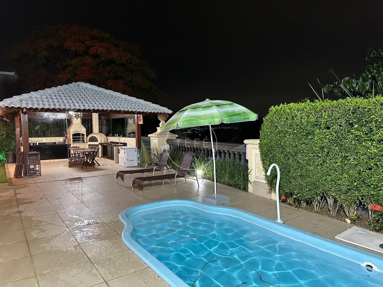 Piscina com cascata e área de quintal com brinquedo infantil